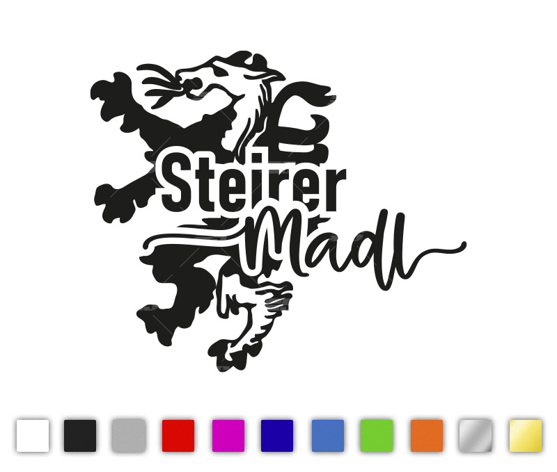 Material: gegossene PVC Folie für KFZ in Profiqualität hochglänzend. Motiv "A liab´s Steirer Madl" konturgeschnitten in vielen Farben und Größen.